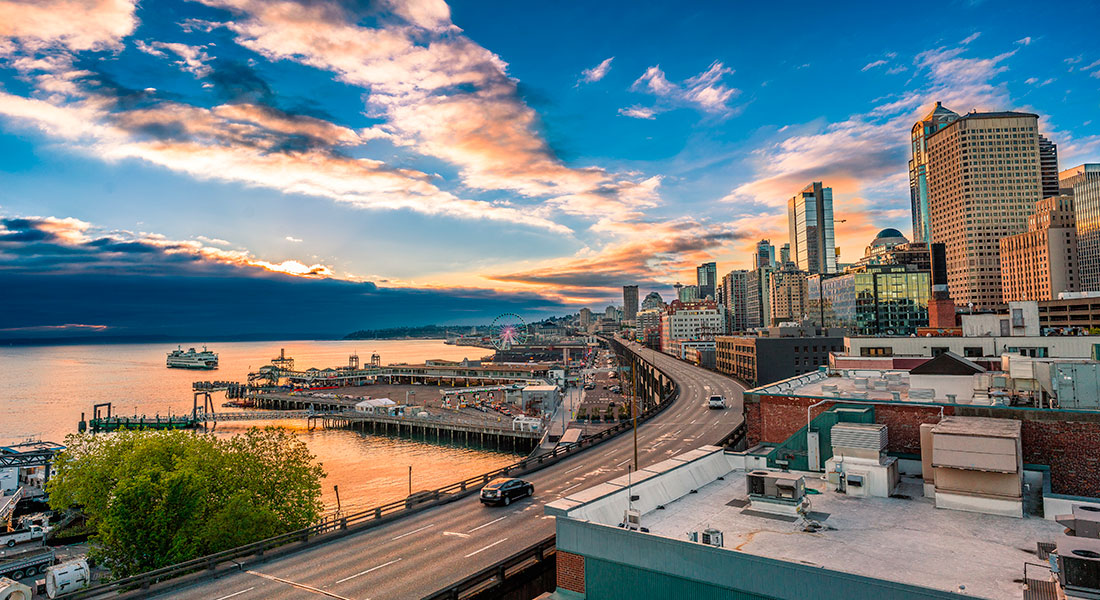 Сиэтл расположен на перешейке между заливом Пьюджет-Саунд (залив Тихого океана) и озером Вашингтон. Это самый северный крупный город Соединённых Штатов, расположенный примерно в 100 милях (160 км) к югу от канадской границы. Сиэтл является важным торговым узлом с Восточной Азией.